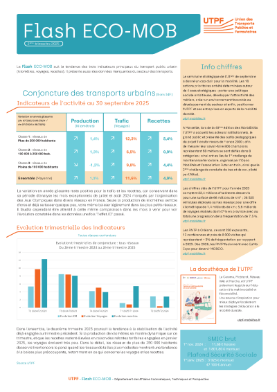 Le Flash ECO-MOB suit la tendance des trois indicateurs principaux du transport public urbain (kilomètres, voyages, recettes). Il présente aussi des données marquantes du secteur des transports.