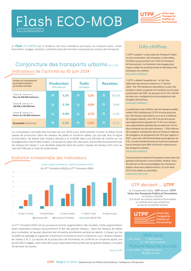 Le Flash ECO-MOB suit la tendance des trois indicateurs principaux du transport public urbain (kilomètres, voyages, recettes). Il présente aussi des données marquantes du secteur des transports.
